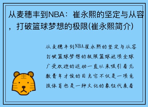 从一个普通的韩国小镇麦穗丰,到走上世界篮球殿堂——NBA,崔永熙的成长历程可以说是一路打破极限,超越自我的过程。他的故事不仅仅是一段篮球生涯的回顾,更是对梦想、毅力、坚持与勇气的真实写照。